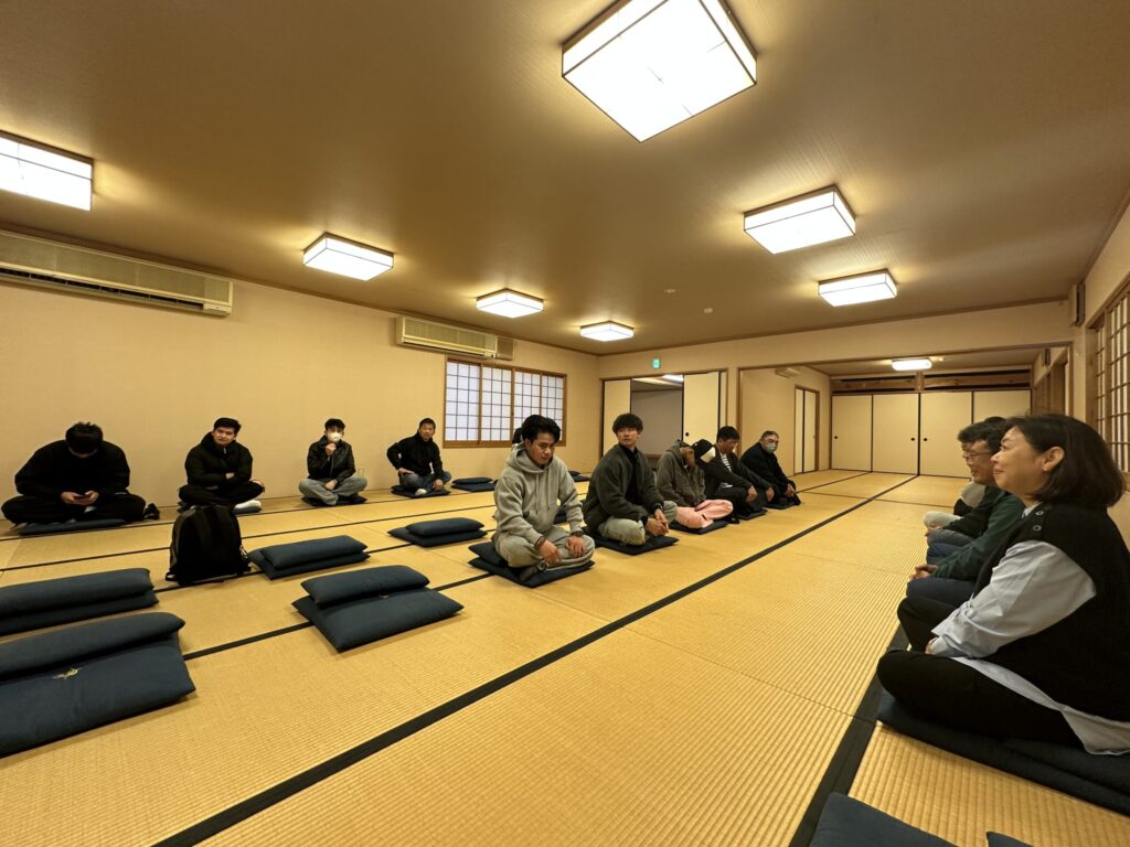 座禅体験では、正しい姿勢と正しい呼吸法を意識して20分間の座禅を行いました。